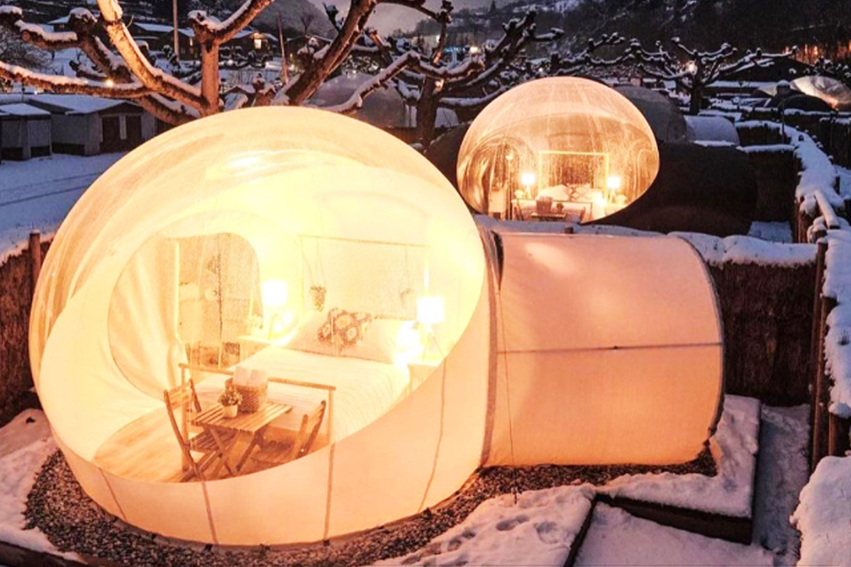 별빛 아래에서 잠을 잘 수 있는 독특한 숙소로 돔 형태의 투명한 외관이 눈길을 끌고 있습니다.