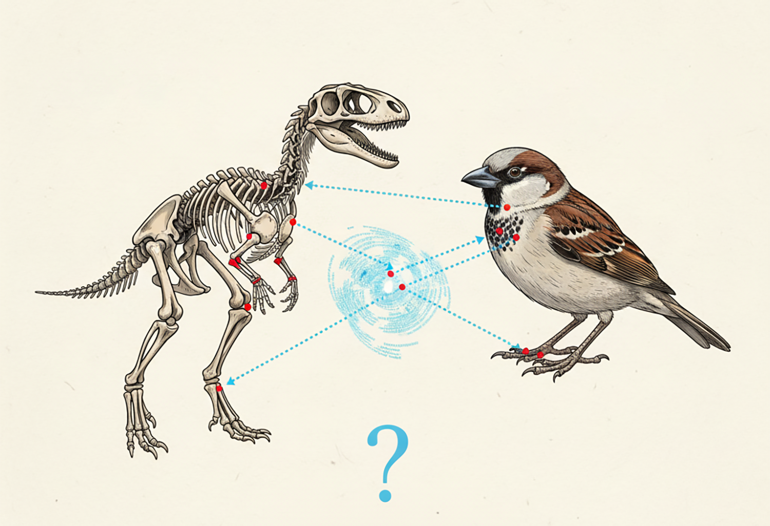 한때 새는 공룡의 후손으로만 여겨졌지만, 현대 과학은 새를 ‘공룡의 한 종류’로 분류한다. 공룡은 크게 조류형과 비조류형으로 나뉘며, 대멸종 시기에 살아남은 것은 작은 몸집을 가진 조류형 공룡뿐이었다. 티라노사우루스와 벨로키랍토르 같은 수각류 공룡은 오늘날 새와 가장 가까운 친척이다. 반면, 같은 시대를 살았던 익룡과 수장룡은 골반과 다리 구조가 달라 공룡으로 분류되지 않는다. 즉, 우리가 하늘을 나는 참새를 볼 때마다 작은 공룡의 후예를 마주하고 있는 셈이다.