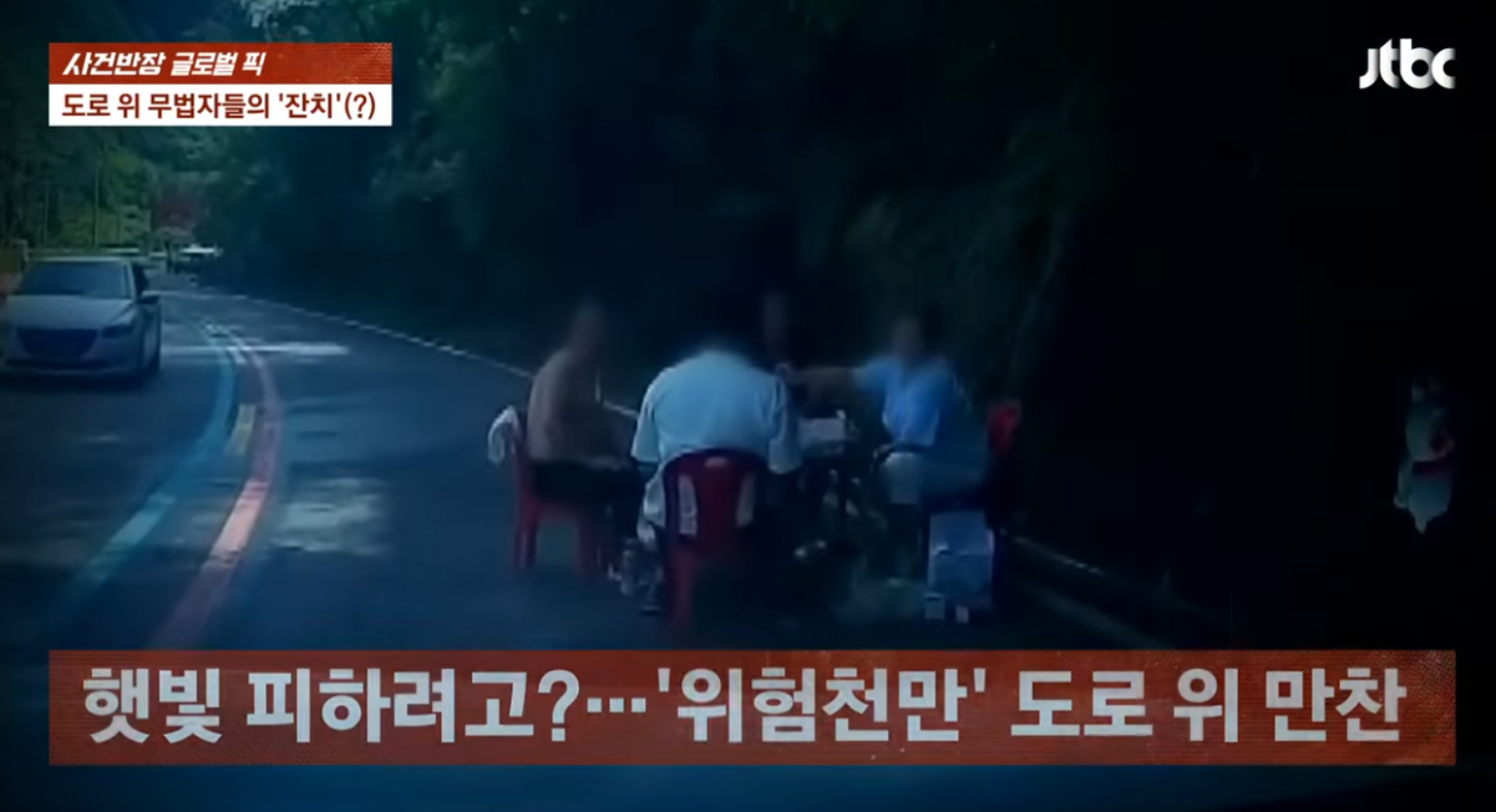 온라인 커뮤니티에 올라온 한 영상이 네티즌들의 공분을 사고 있다. 블랙박스 차량이 아름다운 풍경을 자랑하는 왕복 2차선 도로를 달리던 중, 도로 한가운데 사람들이 모여 식사를 즐기고 있는 모습이 포착된 것이다. 영상 속 사람들은 테이블과 의자까지 동원해 마치 피크닉을 즐기듯 도로를 점거하고 있었다.