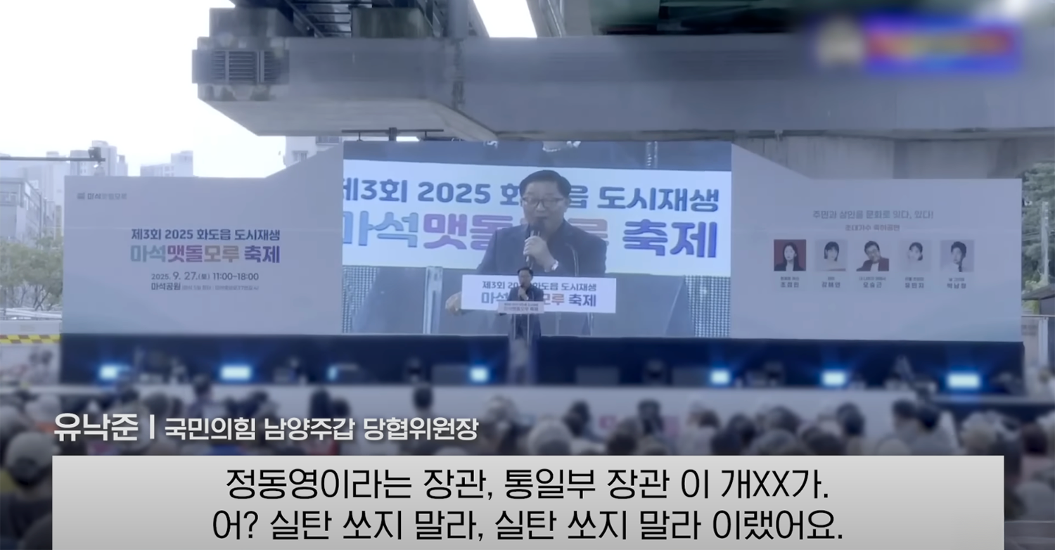 지난 9월 27일, 경기 남양주 화도읍 마석 모루 축제는 순식간에 축제의 의미를 잃었다. 국민의힘 윤낙준 당협위원장이 축사 도중 정동영 통일부 장관을 직접 거론하며 욕설까지 쏟아내자, 행사장은 곧바로 술렁임과 고성이 뒤섞인 혼란으로 빠져들었다.
