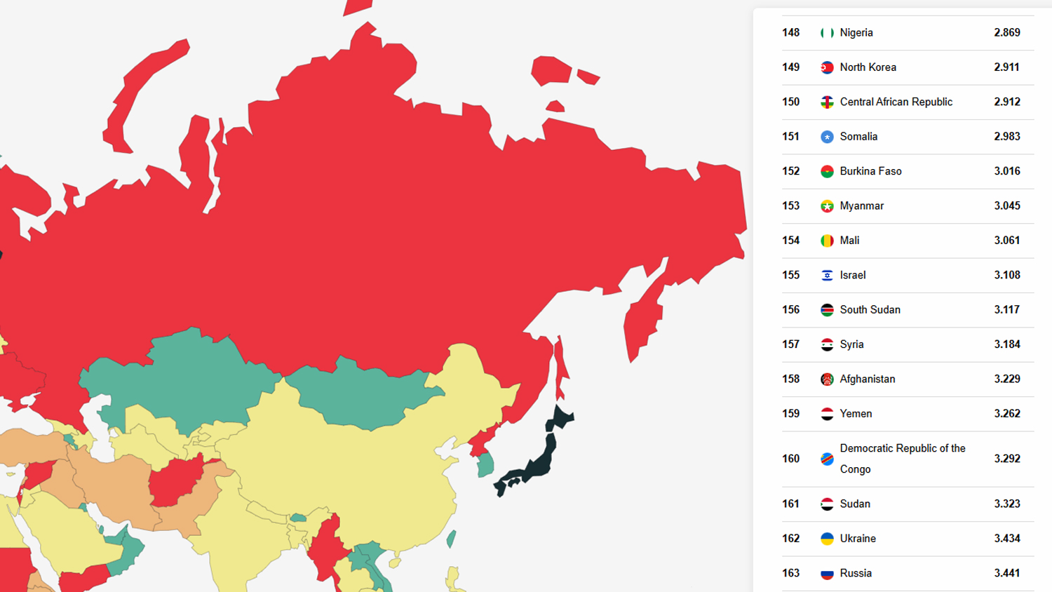 미국은 128위로, 방글라데시나 인도보다 낮은 순위를 기록했다. 총기 범죄, 사회 갈등, 대외 군사 개입 등이 원인으로 꼽혔다. 한편, 전쟁 중인 우크라이나(162위)와 러시아(163위)는 각각 최하위권에 자리했다.