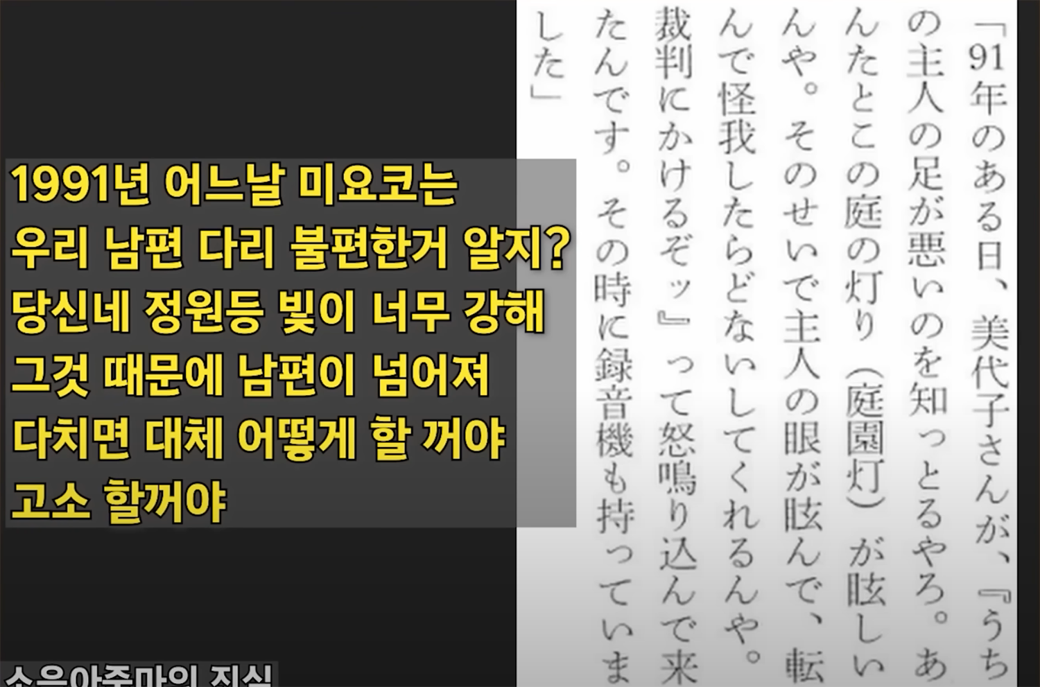 여기서 끝이면 단순한 ‘민폐담’이다. 하지만 촉발 버튼을 누른 쪽이 누구였는지, 그 뒤에 무엇이 있었는지 묻는 순간 진실은 뒤집힌다. 그녀의 이웃 야마모토 부부가 먼저 밝은 조명을 미호코 집을 향하게 설치하고, “딸이 또라이다(앓고 있는 병 때문에 자주 발작을 일으킴)”라는 악성 소문을 마을에 퍼뜨렸다는 증언이다. 현관 열쇠 구멍에 접착제를 바르고, 수십 명을 모아 집단 항의를 벌였다는 기록도 뒤따른다. 이에 저항 하자 야마모토는 밝은 조명과 CCTV로 그녀의 일거수일투족을 찍어 언론에 제보했고, 일본 전역이 그 영상을 소비했다.