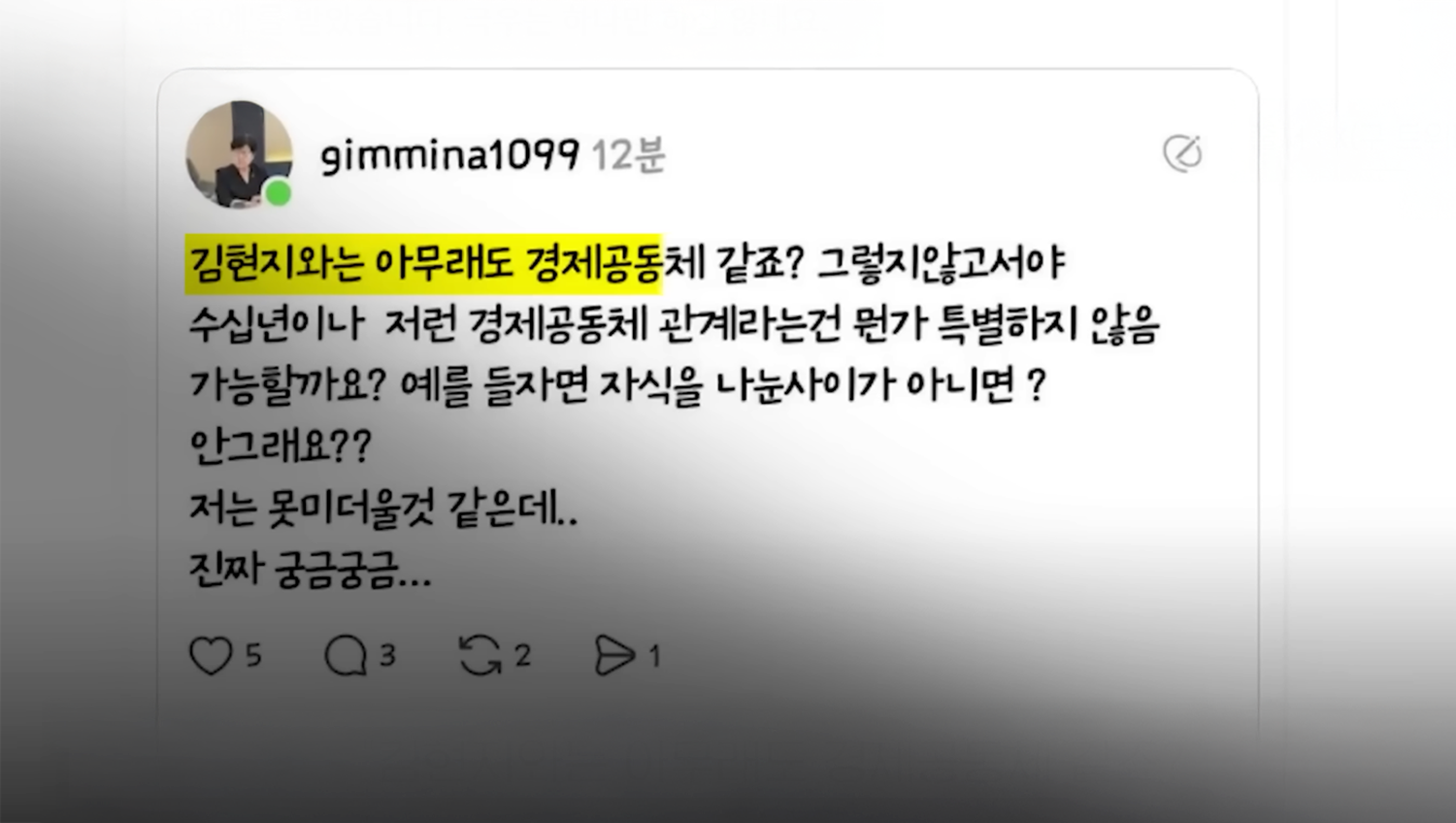 김 의원은 자신의 SNS에 “김현지와는 아무래도 경제공동체가 아니고서야…”라며, “수십 년 동안 그런 관계라면 자식을 나눈 사이라는 뜻 아니냐”는 글을 올렸다. 주어는 없었지만, 문맥상 이재명 대통령과 김현지 실장을 지목한 듯한 뉘앙스였다. 해당 글은 곧 삭제됐지만, 인터넷은 이미 발칵 뒤집혔다.