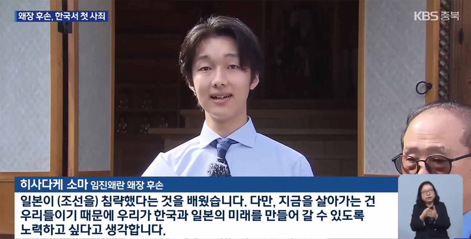 1592년 조선을 침략했던 일본 장수의 후손들이 433년 만에 우리 땅을 찾아 참회의 뜻을 밝혔다. 일본인 히사다케 소마(24)와 히로세 유이치(70)는 지난 10일 충북 옥천 가산사에서 열린 ‘광복 80주년 한일 평화의 날’ 행사에서 두 손을 모아 선조의 만행을 사죄했다. 가산사는 의병장 조헌 선생과 승병장 영규 대사의 진영이 모셔진 호국 사찰로, 국가보훈부가 이번 행사를 주최했다.