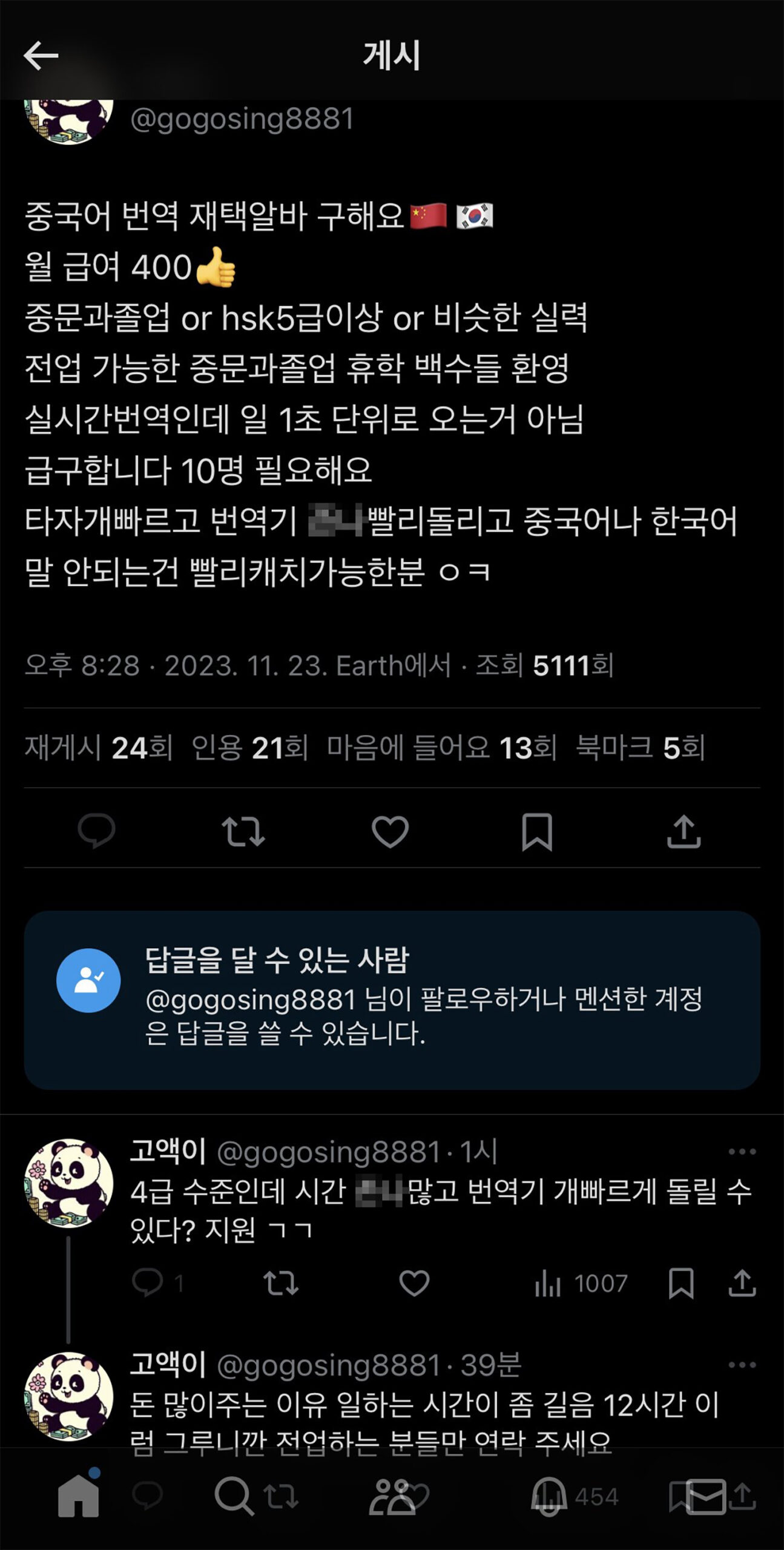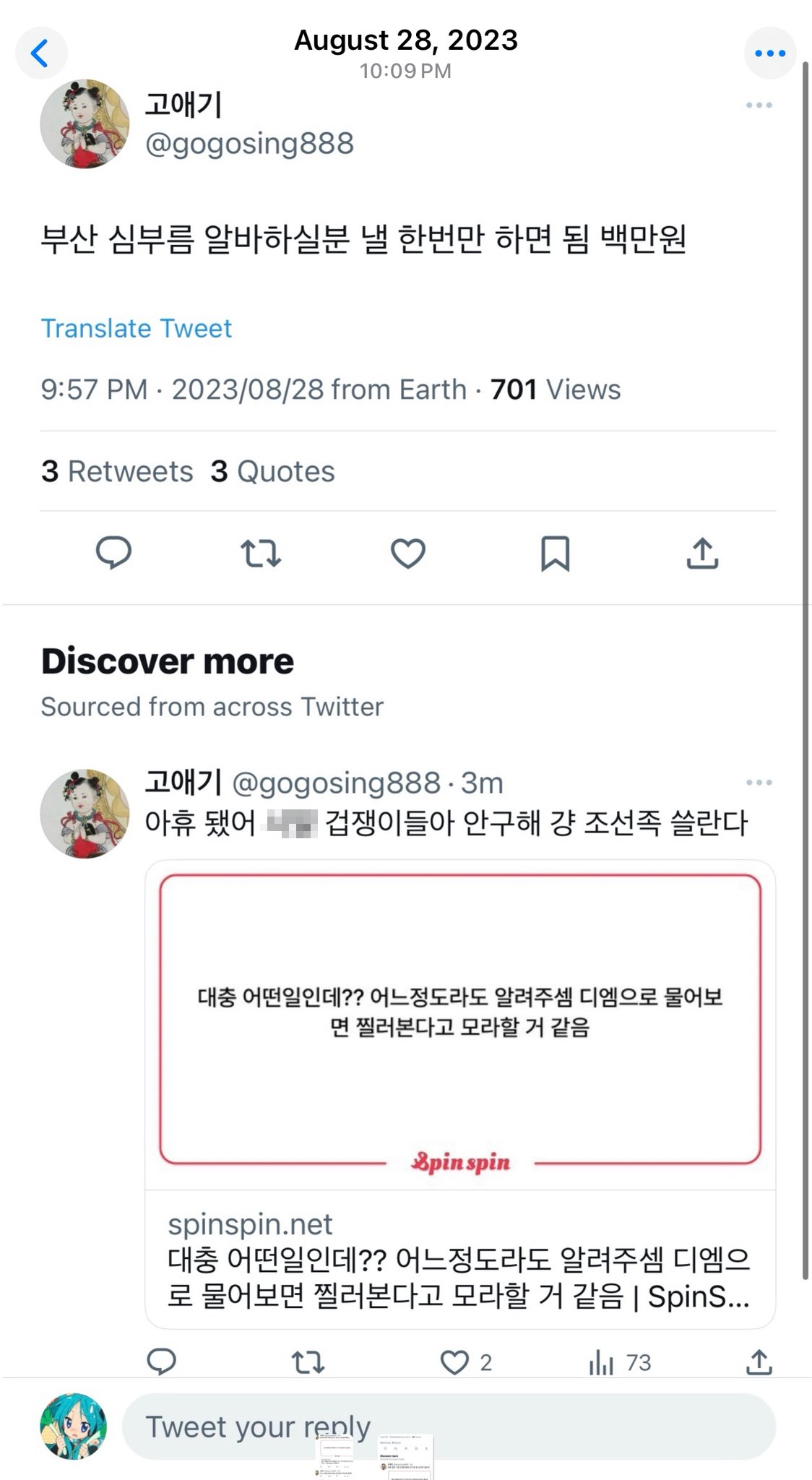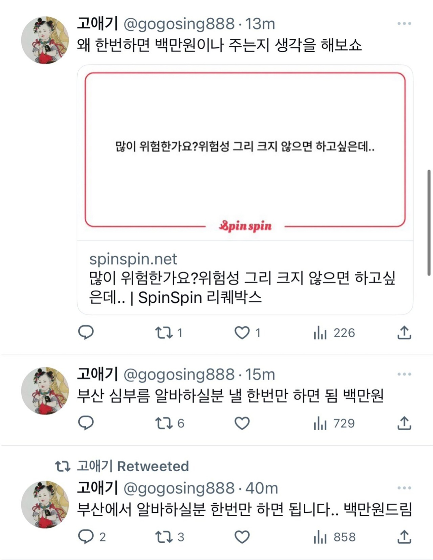 그러나 그녀의 행보에는 석연치 않은 점들이 섞여 있었다. 때로는 부산 지역에서 “단순 심부름 한 번에 100만 원을 주겠다”는 터무니없는 고액의 아르바이트를 구인하는 글을 올려 의혹을 사기도 했다. 또 얼마 전에는 동남아시아에서 3개월가량 함께 일할 20대 중국어 통역 남성을 찾는다는 글을 게시해 누리꾼들의 이목을 끌었다. 당시 이 모집 글을 보고 지원을 고려했던 한 누리꾼은 바쁜 일정으로 포기했는데, 이번 체포 소식에 “그때 지원했으면 지금 이 세상 사람이 아니었을 것”이라는 섬뜩한 반응을 보이고 있다.