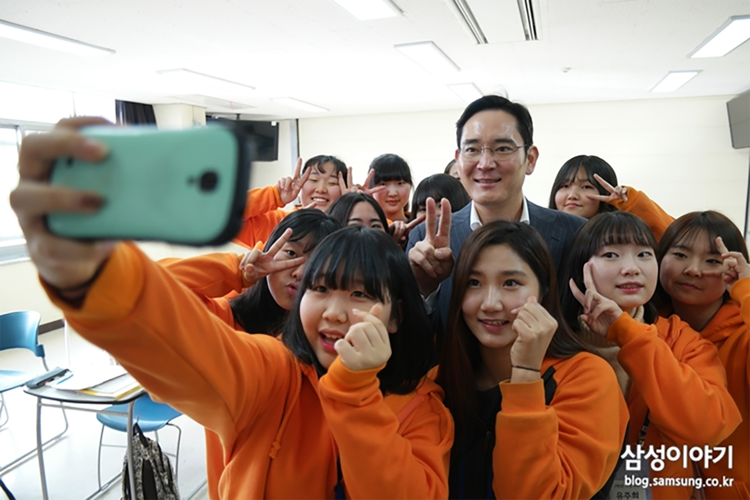 2016년 대전 충남대에서 열린 ‘드림클래스’ 겨울캠프에서 학생들과 셀카 찍는 이재용 회장 – 출처: 삼성 블로그
