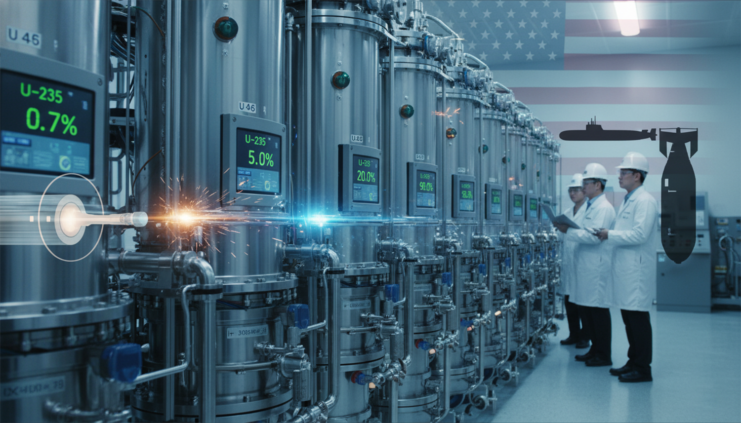 핵잠 얘기의 출발점은 우라늄이다. 산에서 캐낸 광석에는 우라늄이 0.05~0.5% 정도만 들어 있고, 그 안에서 원전 연료가 되는 우라늄235는 0.3%도 안 되는 극미량에 불과하다. 이를 원심분리기로 세탁기 탈수 돌리듯 계속 돌려 농축도를 높여야 비로소 연료봉이 된다. 약 5%까지 올리면 원자력 발전소용 연료, 20% 수준이면 핵추진 잠수함·항공모함 연료가 된다. 이 선까지는 저농축이자 평화적 이용 영역이다. 문제는 같은 설비를 더 세게 돌려 90% 안팎까지 끌어올리면 히로시마에 떨어진 ‘리틀보이’ 급 고농축 우라늄, 즉 핵폭탄 원료가 된다는 점이다. 그래서 미국은 한미 원자력협정에 20% 미만 농축은 미국 허가 하에 제한적으로만 가능하다고 못을 박아 두고 지금껏 권한을 쥐고 있었다.