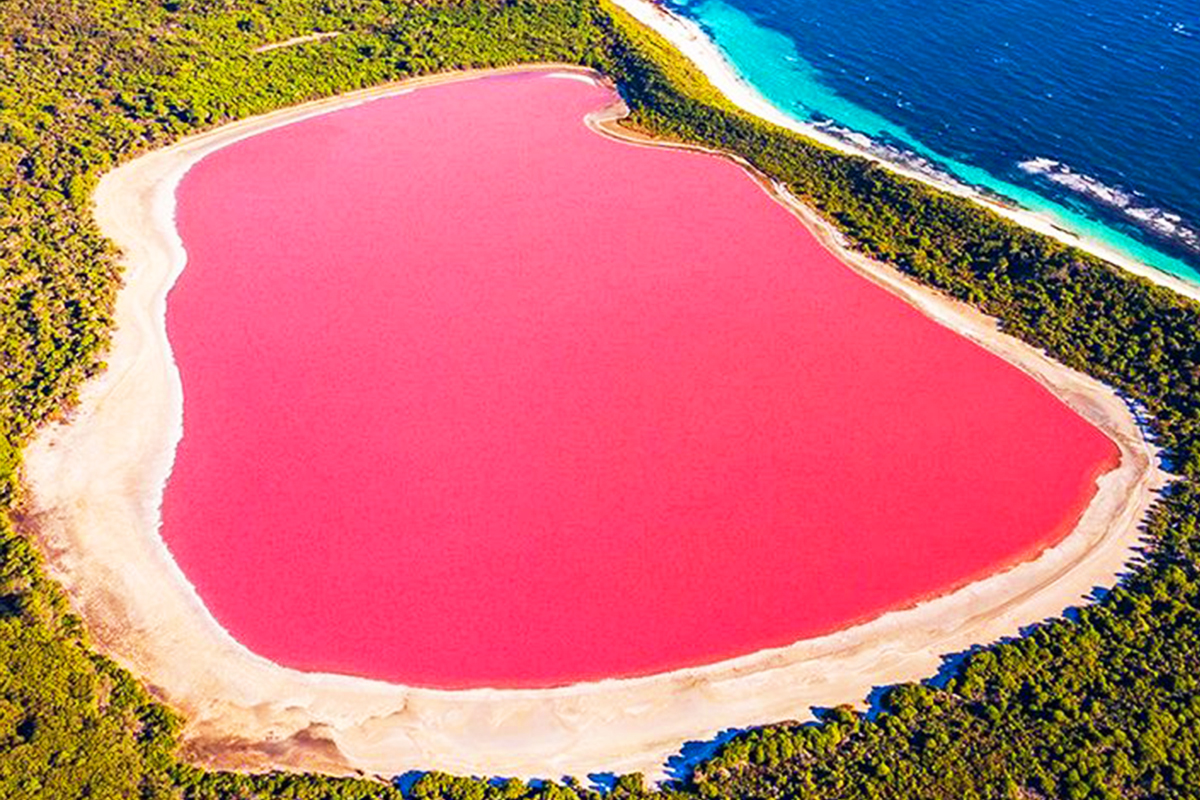 서호주 러쉐어쉐이 군도에 위치한 미들 아일랜드에 있는 ‘힐리어 호수’ (Lake Hillier)는 신비로운 풍경을 자랑하는 곳입니다.