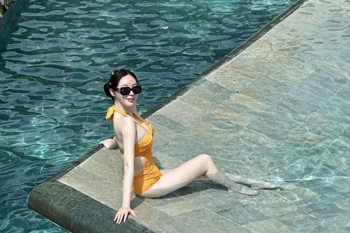 가슴 부분이 깊게 파인 섹시한 수영복을 입고 탄탄한 몸매를 드러내 눈길을 끌었다.