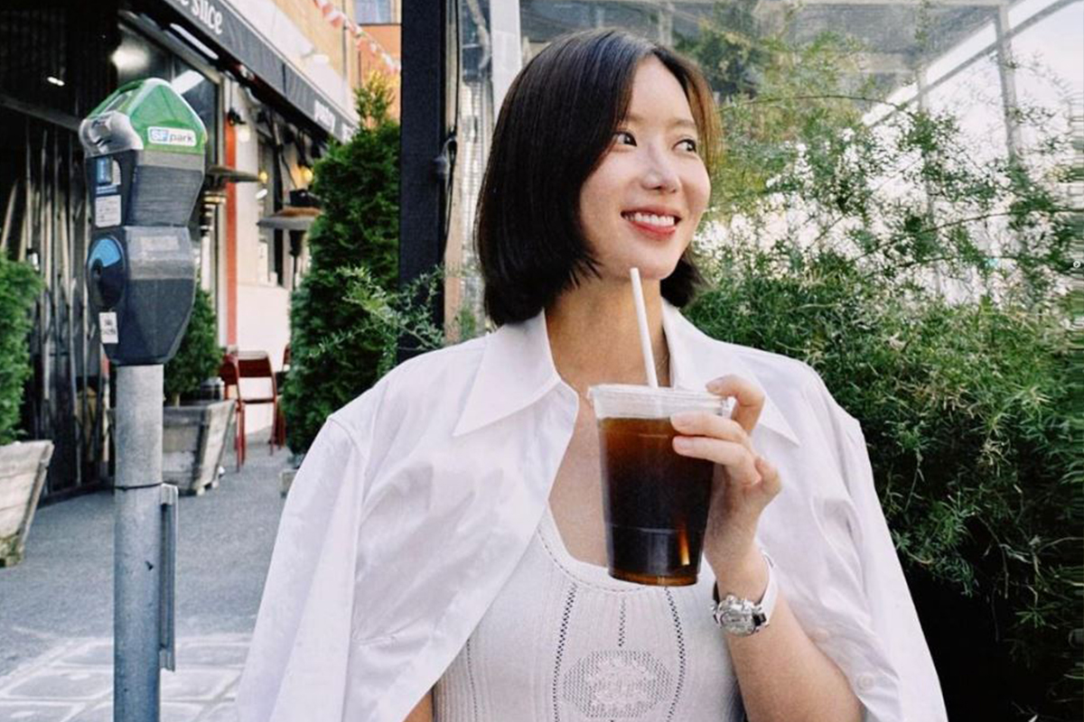 임수향은 넓게 펼쳐진 잔디밭에서 커피를 손에 들고 자유로운 모습으로 시간을 보냈다.