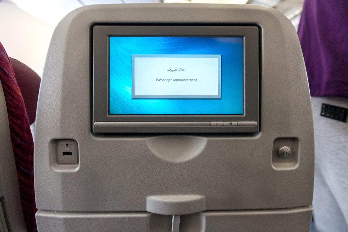 기내 안내방송이 시작되면 승객이 집중할 수 있도록 모니터가 일시 정지되고 안전에 관련한 영상이 재생되고 있다.