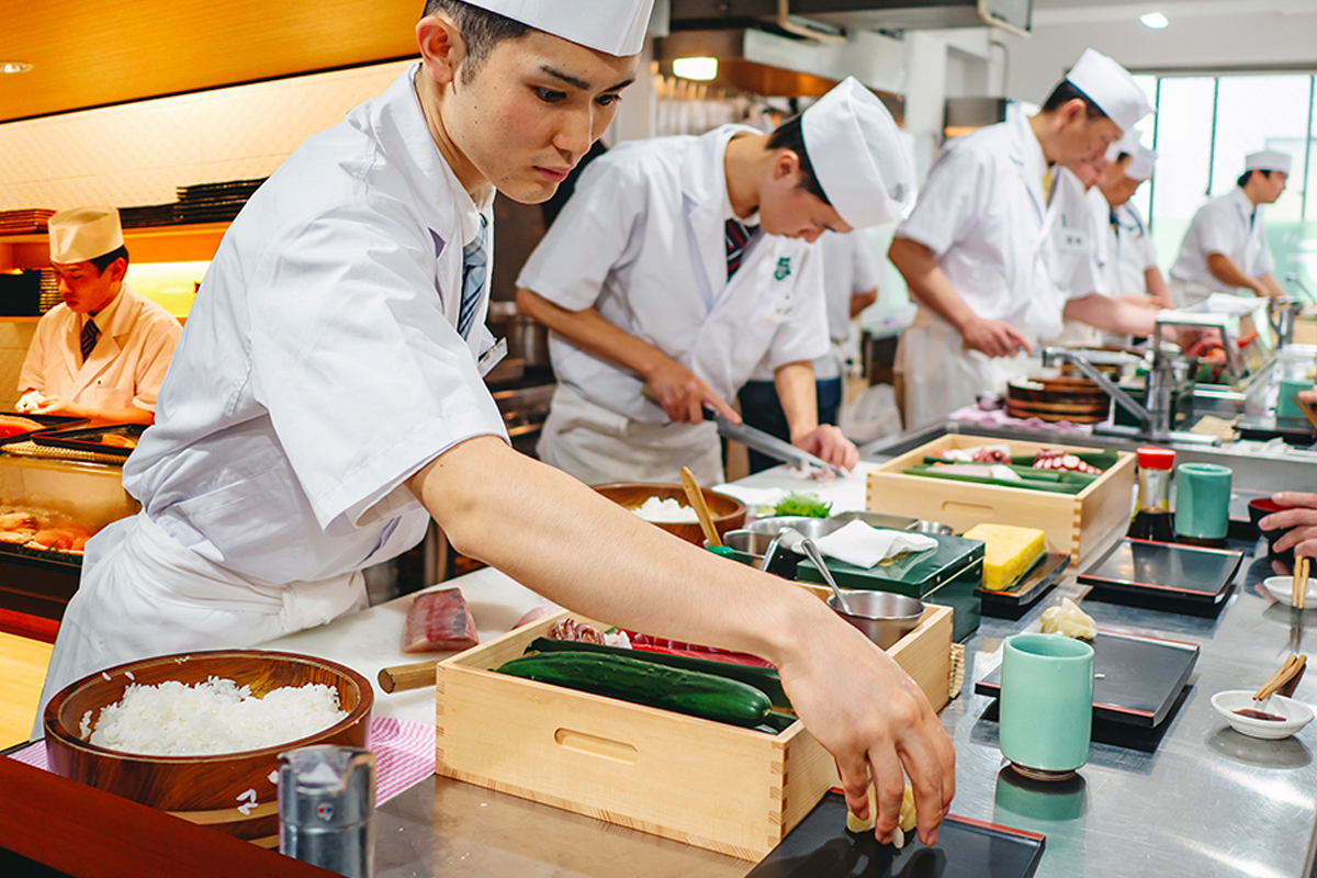 일본에서 스시를 만드는 사람이 되기 위해서는 적어도 약 10년간의 긴 수련이 필요합니다. 오랜 시간 스시에만 몰두해야 스시 장인이 될 수 있죠. 전통을 계승하고 오랜 기간 동안 스시에 관해 배우는 것을 무척 중요하게 생각하고 있습니다.