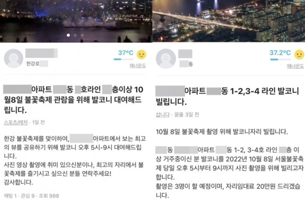 한 중고거래 앱에서는 불꽃축제 당일 오후 6시부터 자정까지 6시간 동안 마포구에 있는 한강 전망 아파트를 70만 원에 대여하겠다는 글이 올라왔는데요.
