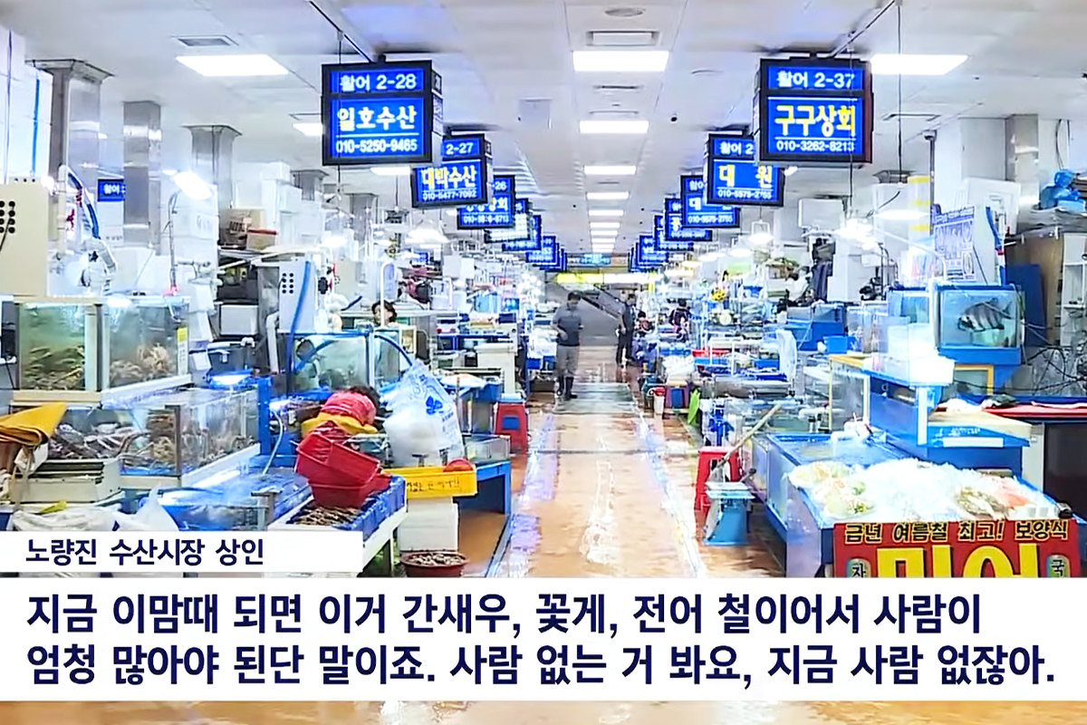 노량진수산시장에서 30년째 장사를 하는 한 상인은 “아이엠에프(IMF) 사태 당시에도 이 정도로 손님이 없지는 않았다”며 “최근 경기 침체 등 불황에 오염수 논란까지 이어지면서 작년 대비 매출이 40% 수준으로 떨어졌다”고 힘든 상황을 전했습니다.