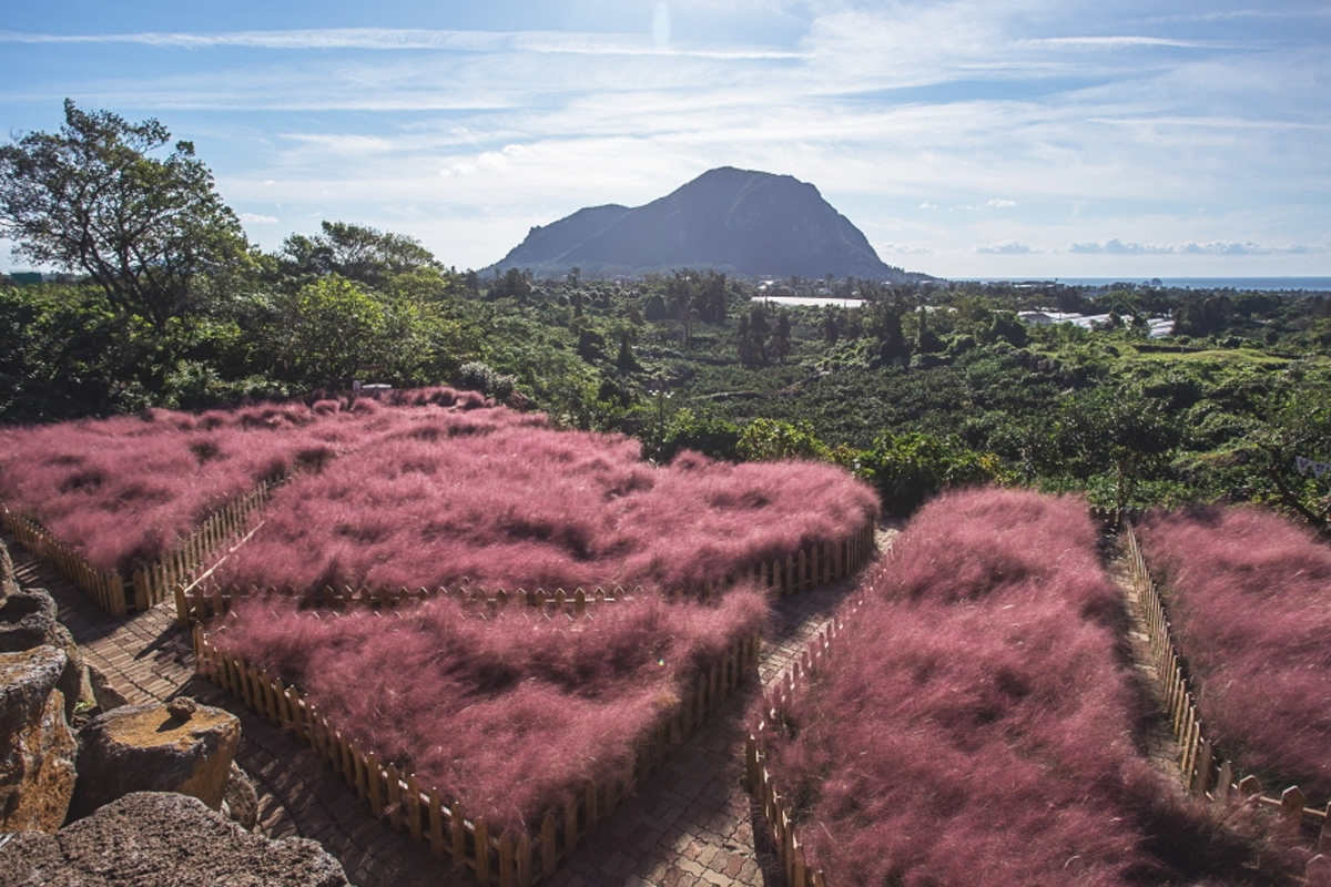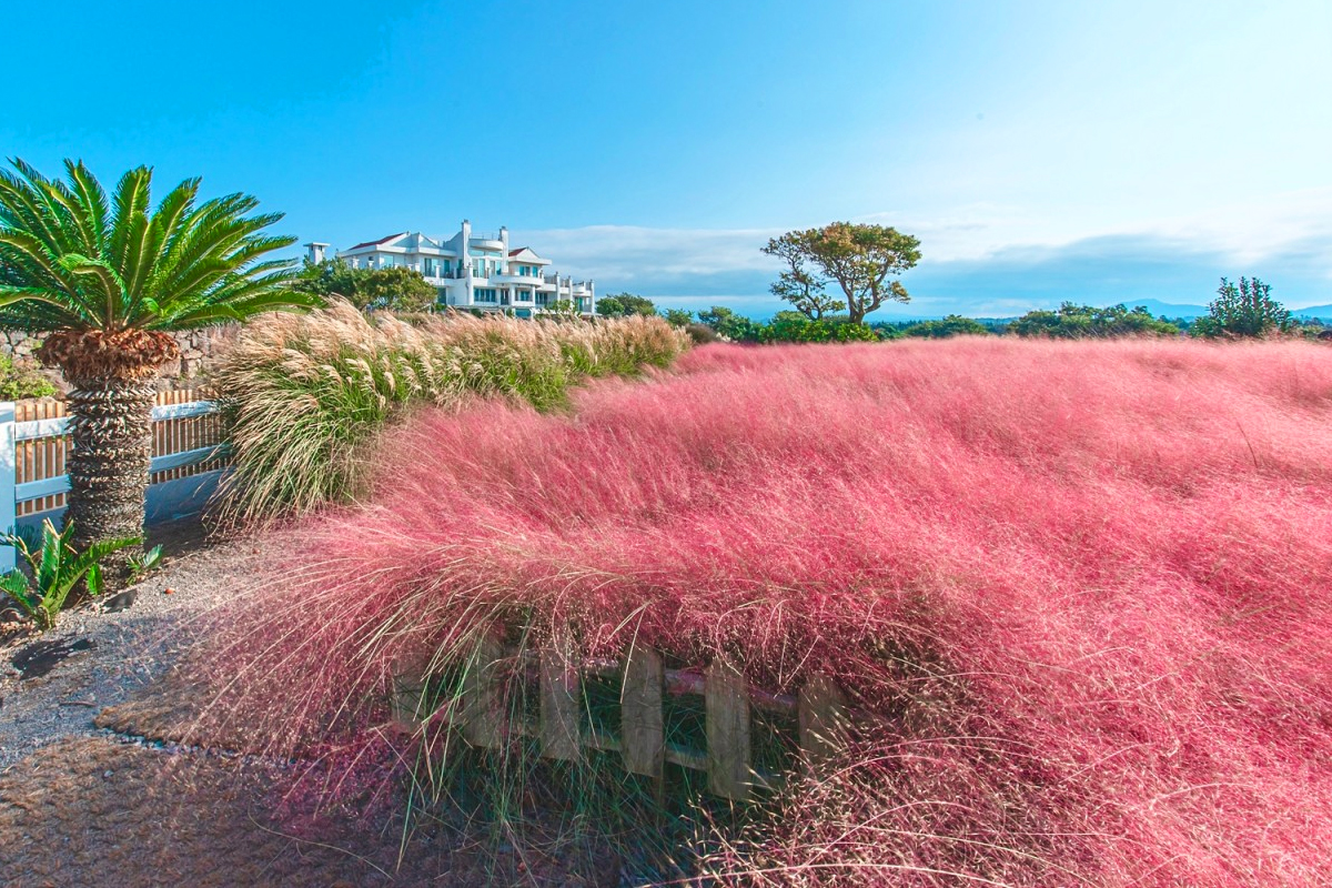 마노르블랑은 산방산을 배경으로 한 핑크뮬리를 볼 수 있는데요.
